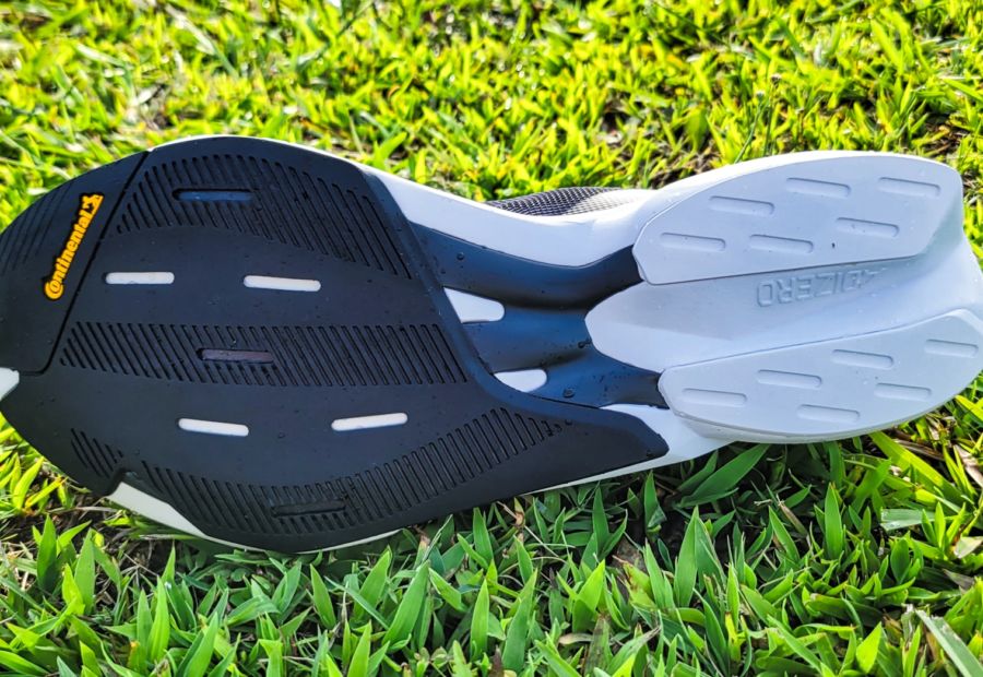 The outsole of the shoe has a thin slab on Continental rubber. The grip is good for going as quick as possible on tight turns and it fairs well on slick surfaces.