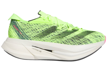 “The adidas Adizero Pro is a top of the line racing shoe which screams “technology” with its firm yet extremely breathable upper; springy, cushioned ride and quick transition due to its carbon plated dual-foam midsole; and lacing options which allow runners to customize their fit—like a Pro. This shoe is best at race paces, and its benefits are enhanced when running long.”